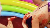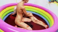 The two seductive girlfriends, blonde and brunette, were enjoying an intimate and passionate red bath session in their colorful inflatable pool, setting the mood for a sensual evening ahead.The lesbian temptresses had on their alluring lingerie, accentuating their incredible figures with their perfectly designed underwear.They knew they were going to pleasure each other tonight and made sure that their seductive outfits would give them easy access when it came time to satisfy one another.As the blonde began to take off her stockings while her brunette girlfriend spread out some luxurious nylons next to them, she couldnt help but feel aroused by the anticipation of the night ahead.They exchanged loving gazes before sharing a passionate kiss that sent shivers down their spines and ignited an even more powerful passion in their souls.The blonde, with her hands all over the brunettes voluptuous breasts and hard nipples, could feel herself getting wet by the second, as her partners fingers traced gentle patterns on her sensitive skin.Her breathing was labored now as she yearned to feel the warmth of her lovers body against hers.The blonde knew that this moment would be unforgettable their desire for each other had never been stronger.As they kissed, tongues intertwined and bodies pressed firmly together, the brunette slid one hand down the blondes slender legs and began to gently caress her shaved cunt, teasingly moving in rhythm with the thrusting of their hips.The blonde, overwhelmed by the sensations, moaned softly, aching for more.The brunette could feel her own pussy throbbing in response, wetness seeping from between her lips and coating the folds of her labia.As they broke their kiss, the blonde moved down to attend to her brunette girlfriends needs, licking and sucking at her clit while sliding fingers through the honeyed folds of her cunt.The brunette, her hands now gripping tightly onto the blondes head, arched her back in ecstasy as she felt waves of pleasure surge through her body.She was soon returning the favor with equal fervor, fingers diving deep into the blondes juicy pussy while her tongue flicked and teased at her clit.Their mutual pleasure grew, each girl eager to make her lover cum as they fingered and licked in syncopation.The pool water beneath them rippled with the intensity of their passion, reflecting back the colors of the inflatable surroundings.As they climaxed together, waves of blissful euphoria washed over their naked bodies, bathing them in a happiness that could only be achieved through lovemaking with someone they adored so deeply.
